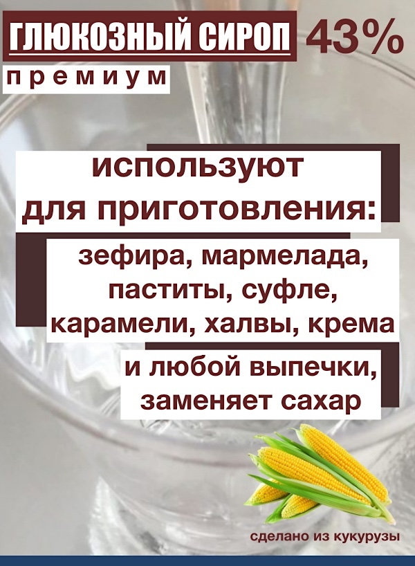 Сироп глюкозы – это концентрированный водный раствор моносахаридов, полученных гидролизом и очисткой крахмала, в данном случае кукурузного. Он сладкий, но не настолько, как сахар и фруктоза. В глюкозе совершенно нет приторности и неприятного послевкусия (которое остаётся после сахара). С глюкозой можно пить чай и добавлять в выпечку.