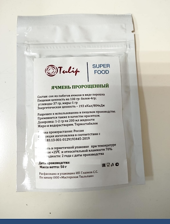 Сублимированный порошок-пудра сок ростков ячменя не имеет посторонних примесей, мгновенно растворяется в любой жидкости, не обладает ярким вкусом, энергетическая ценность 193 ккал/100 г, белки 4.0 г, углеводы 37 г, жиры 1.0 г.