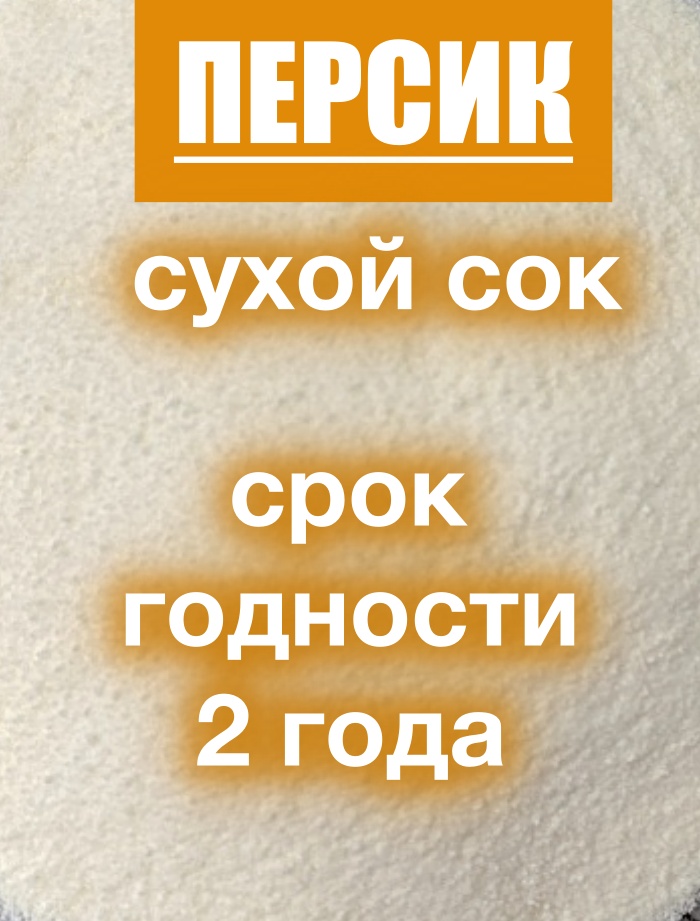 Сублимированный сок порошок-пудра плодов персика не имеет посторонних примесей, мгновенно растворяется в любой жидкости, не обладает ярким вкусом, энергетическая ценность 60 ккал/100 г, белки 0.6 г, углеводы 19 г, жиры 0 г.