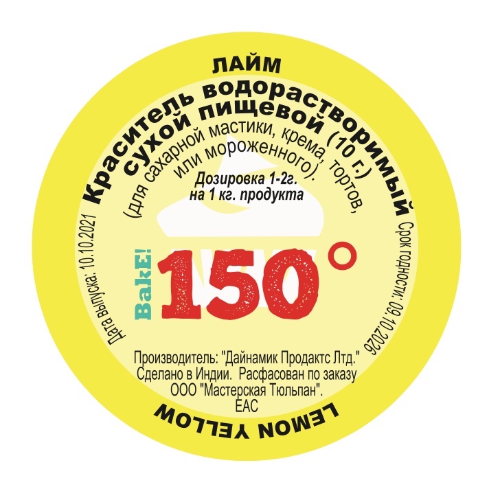 Краситель пищевой сухой водорастворимый ЛАЙМовый 150º Bake!™ - купить в Мастерской Тюльпан. Гарантия качества. Быстрая доставка. Дозировка 1 - 2 г. на 1 кг. продукта. Скидка на первый заказ и постоянным покупателям 5%. Ищите промокод для скидки на нашем сайте.